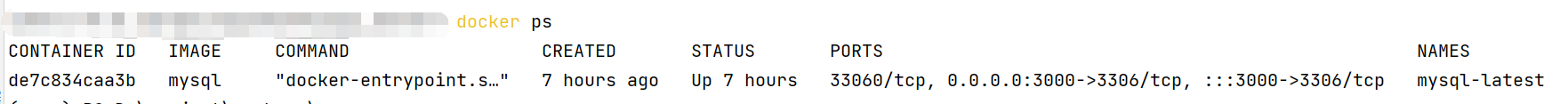 # MYSQL_ROOT_PASSWORD是设置mysql root用户的密码 # 我本地3306端口是被用了的,所以映射到了3000端口 docker run -d -p 3000:3306 -e MYSQL_ROOT_PASSWORD=123456 --name mysql-latest mysql