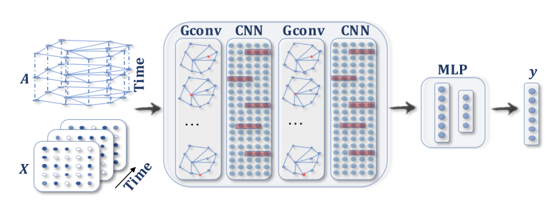 A spatial-temporal graph is an attributed graph where the node attributes change dynamically over time. The spatial-temporal graph is defined as G(t) = (V, E,X(t)) with X(t) ∈ Rn×d. 节点属性随时间变化的图
